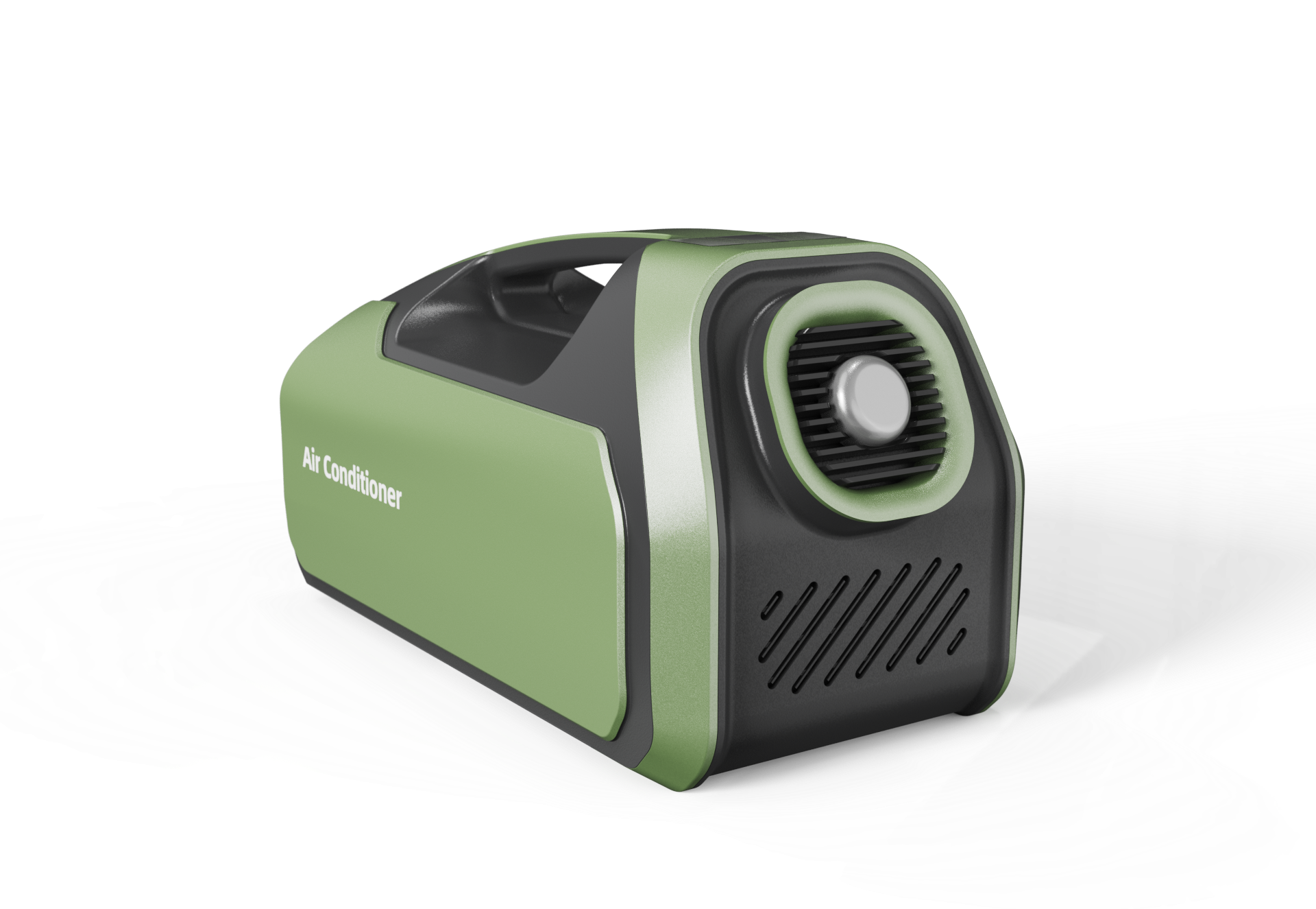 这款户外空调以“便携、高效、多场景适应”为设计核心,旨在为露营、野餐、车载休息等户外活动提供舒适的微气候体验。整体造型简约紧凑,采用一体化曲线机身与哑光质感处理,搭配绿色与黑灰撞色设计,不仅具备强烈的户外风格,同时展现出科技感与现代感。