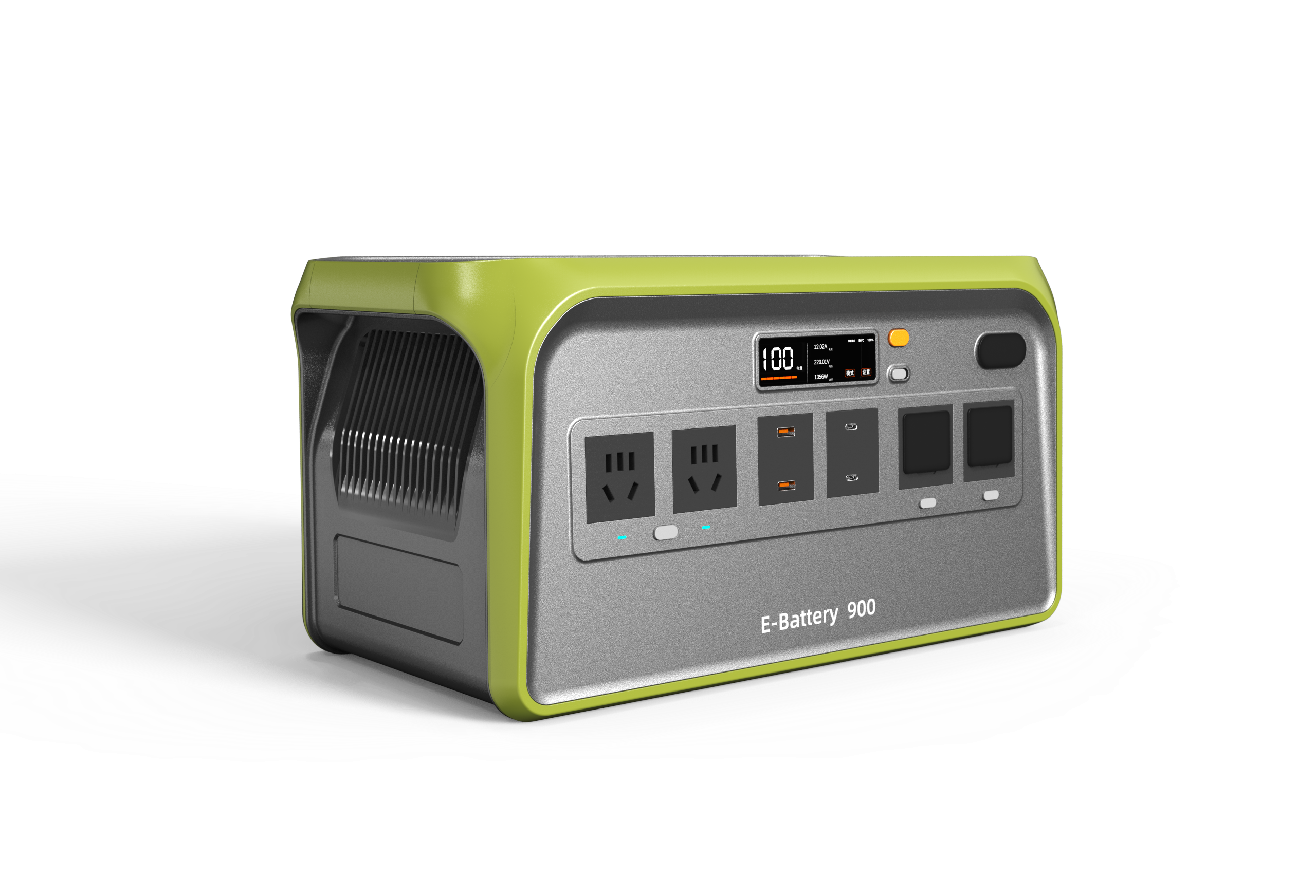 在功能设计方面,它配备了多种类型的输出接口,包括两个通用AC插孔、两个USB-A接口、一个USB-C快充接口以及两个直流输出口,可满足多设备同时充电的需求。正面中央还设有一块高清LED显示屏,能够实时显示电量百分比、电压、电流及工作状态,使用者可随时掌握电池使用情况,提高使用便捷性和可控性。该设备内部搭载高性能锂电芯,具备900Wh的大容量,能为笔记本电脑、无人机、照明设备、手机等设备持续供电数小时,适用于露营、自驾、野外拍摄、停电应急等多种场景。此外,设备内置BMS电池管理系统,有效防止过充、过放、过热和短路等安全隐患,保障用户和设备安全。侧面的散热结构采用纵向条纹设计,提升了整体热交换效率,确保长时间工作依然保持稳定性能。顶部则设计有凹槽托盘区域,可用于临时放置手机、小工具等物品,增强使用灵活性。